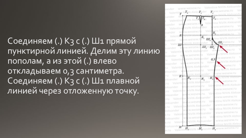 сантиметра – (.) Ш3. Из нее строим вертикальную линию вверх до линии талии. На пересечении ставим (.) Т2 и