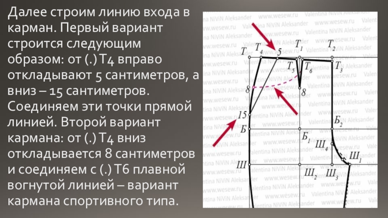 от (.) Т4 вправо откладывают 5 сантиметров, а вниз – 15 сантиметров. Соединяем эти точки прямой линией. Второй вариант кармана: от (.) Т4 вниз откладывается 8 сантиметров и соединяем с (.) Т6 плавной вогнутой линией – вариант кармана спортивного типа.