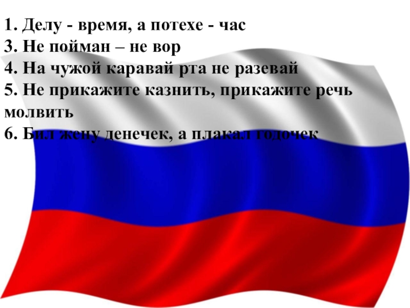 1. Делу - время, а потехе - час 3. Не пойман – не вор 4. На
