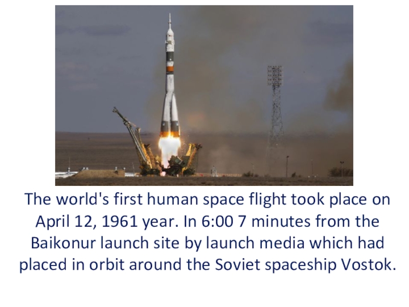 1961 year. In 6:00 7 minutes from the Baikonur launch site by launch media which had placed in orbit around the Soviet spaceship Vostok.