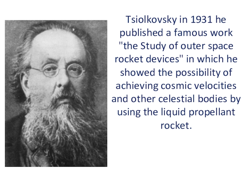 Слайд 5Tsiolkovsky in 1931 he published a famous work "the Study of