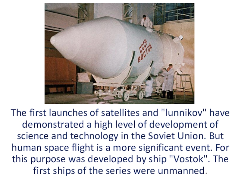 level of development of science and technology in the Soviet Union. But human space flight is a more significant event. For this purpose was developed by ship "Vostok". The first ships of the series were unmanned.