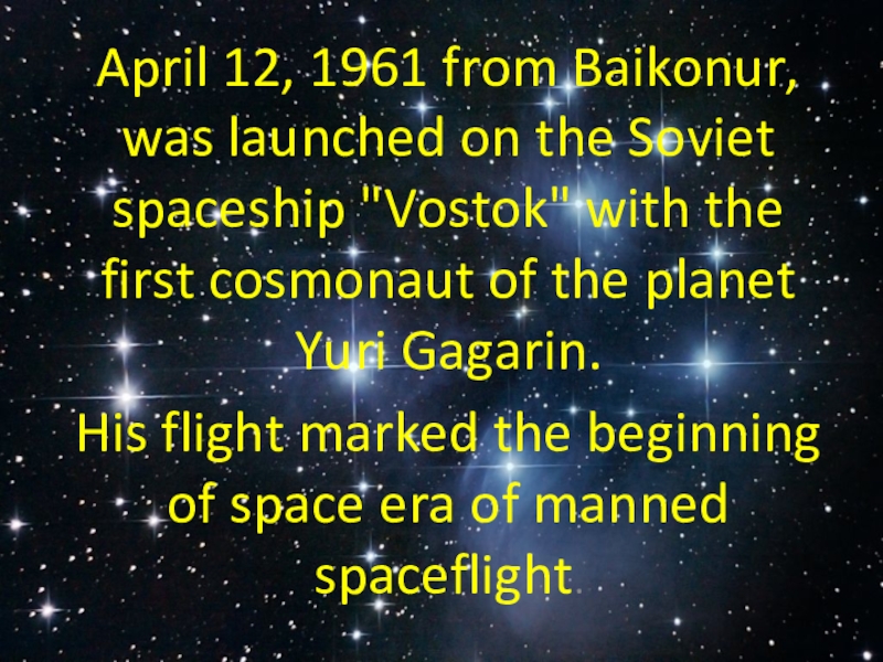 Слайд 2April 12, 1961 from Baikonur, was launched on the Soviet spaceship