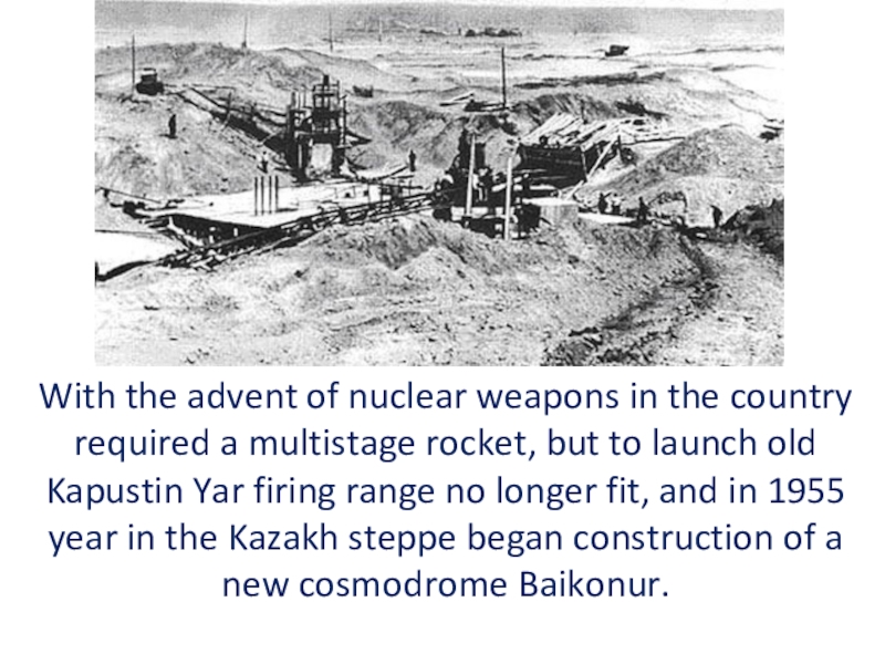 multistage rocket, but to launch old Kapustin Yar firing range no longer fit, and in 1955 year in the Kazakh steppe began construction of a new cosmodrome Baikonur.