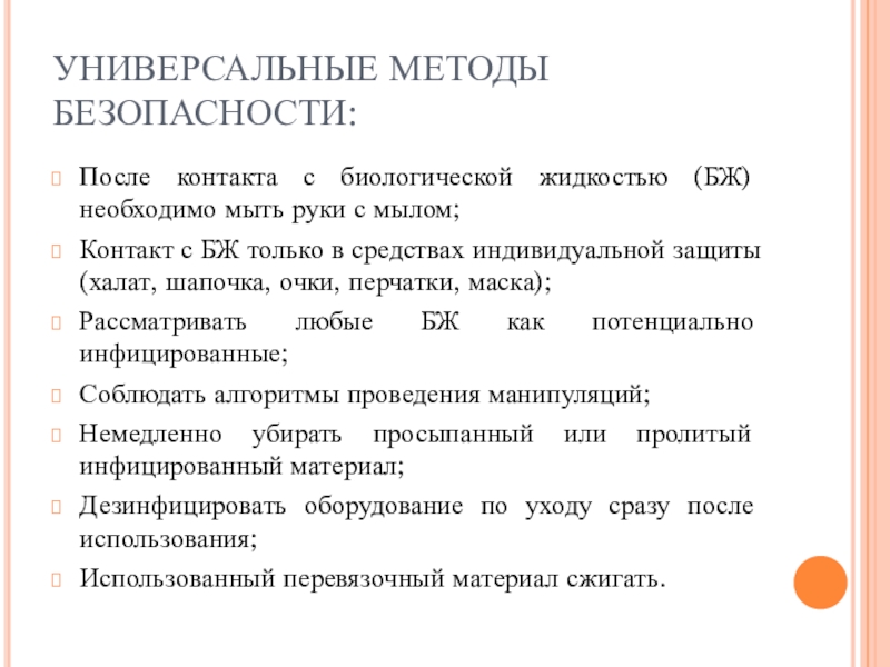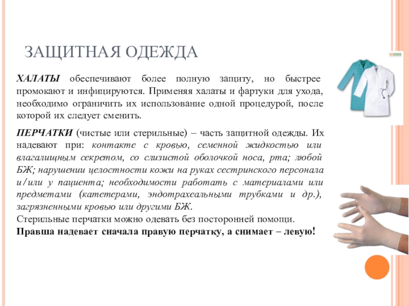 ПЕРЧАТКИ (чистые или стерильные) – часть защитной одежды. Их надевают при: контакте с кровью, семенной жидкостью или влагалищным секретом, со слизистой оболочкой носа, рта; любой БЖ; нарушении целостности кожи на руках сестринского персонала и/или у пациента; необходимости работать с материалами или предметами (катетерами, эндотрахеальными трубками и др.), загрязненными кровью или другими БЖ.