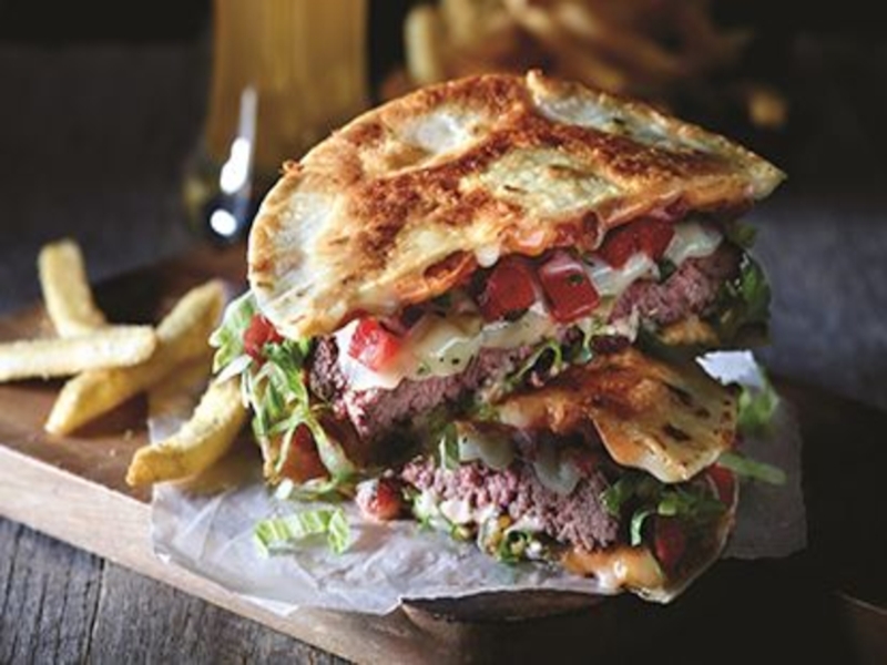 Бургер, в котором обычные мучные булки заменены спрессованной и обжаренной лапшой рамен. Внутри — котлета, руккола, зеленый