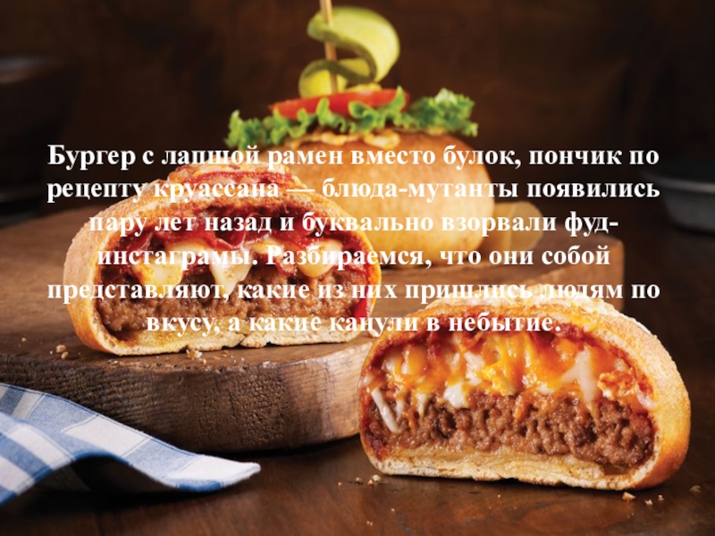 Слайд 12Бургер с лапшой рамен вместо булок, пончик по рецепту круассана —