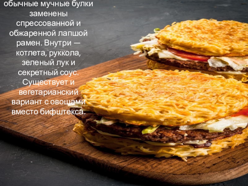 Слайд 13Бургер, в котором обычные мучные булки заменены спрессованной и обжаренной лапшой