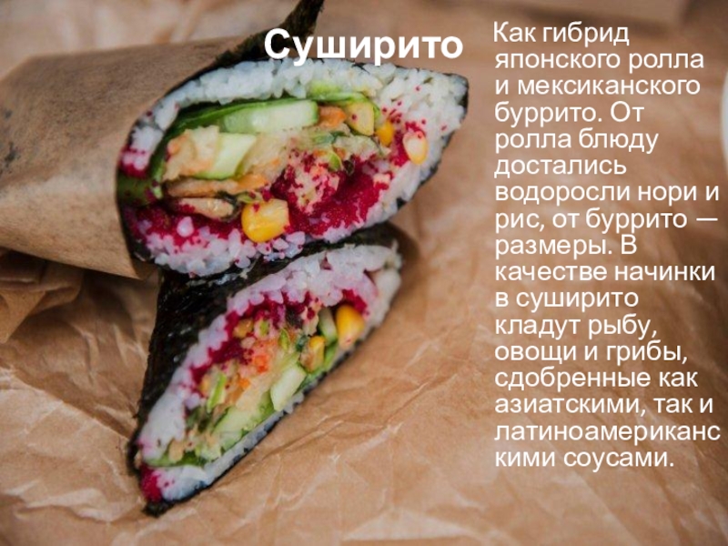 Суширито   Как гибрид японского ролла и мексиканского буррито. От ролла блюду достались водоросли нори и