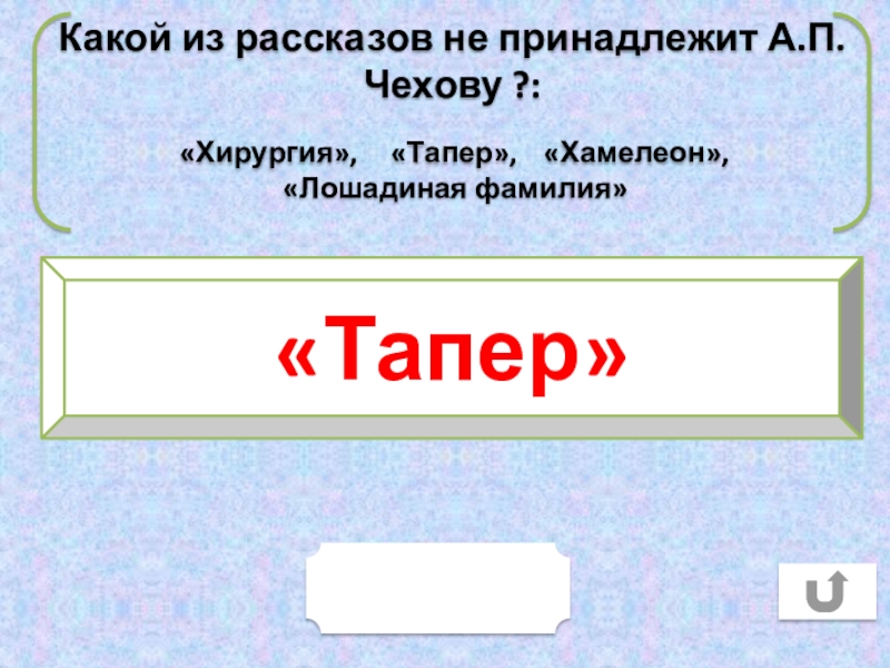 «Тапер»Какой из рассказов не принадлежит А.П. Чехову ?: «Хирургия»,   «Тапер»,  «Хамелеон»,  «Лошадиная фамилия»