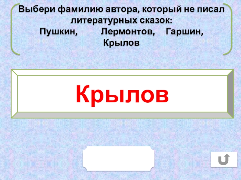 КрыловВыбери фамилию автора, который не писал литературных сказок:Пушкин,      Лермонтов,   Гаршин,
