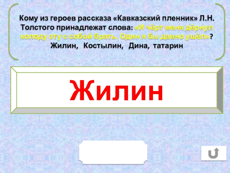 ЖилинКому из героев рассказа «Кавказский пленник» Л.Н. Толстого принадлежат слова: «И чёрт меня дёрнул колоду эту с