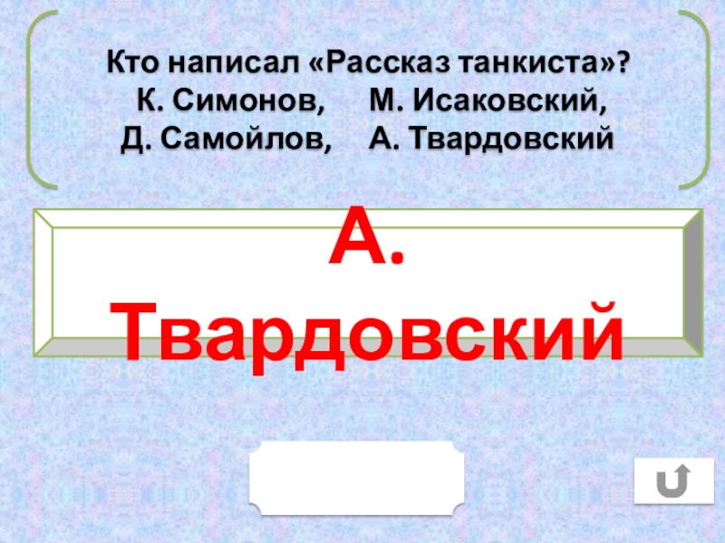 А. ТвардовскийКто написал «Рассказ танкиста»? К. Симонов,   М. Исаковский,   Д. Самойлов,