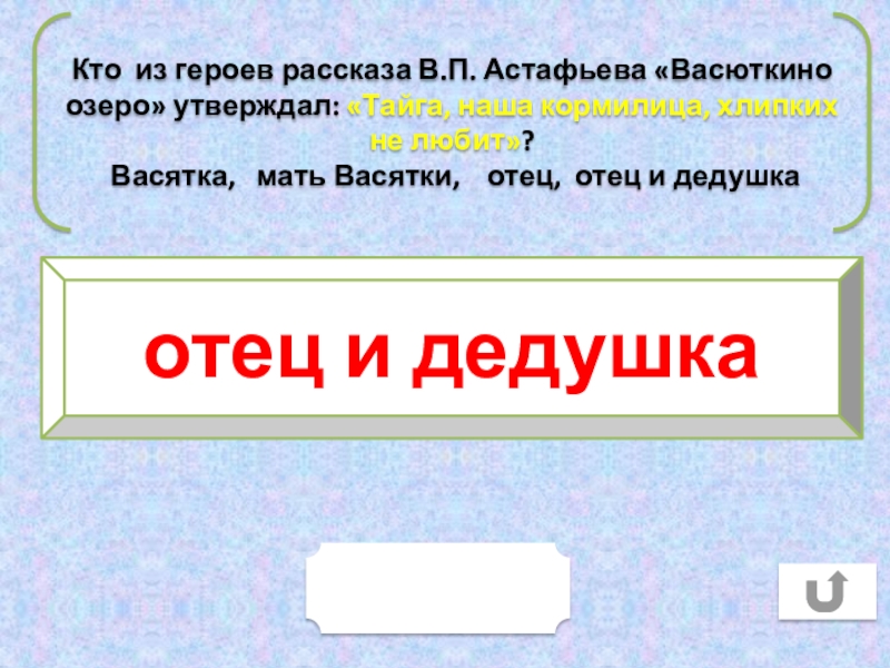 отец и дедушкаКто из героев рассказа В.П. Астафьева «Васюткино озеро» утверждал: «Тайга, наша кормилица, хлипких не любит»?