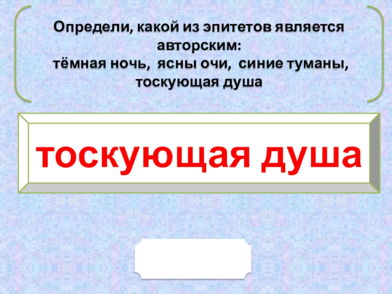 тоскующая душаОпредели, какой из эпитетов является авторским: тёмная ночь, ясны очи, синие туманы,    тоскующая