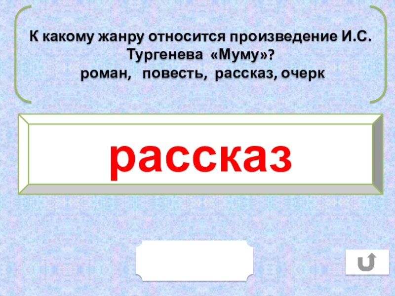 рассказК какому жанру относится произведение И.С. Тургенева «Муму»? роман,  повесть, рассказ, очерк
