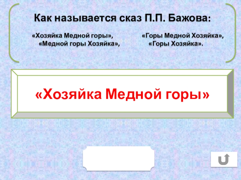 «Хозяйка Медной горы»Как называется сказ П.П. Бажова:    «Хозяйка Медной горы»,