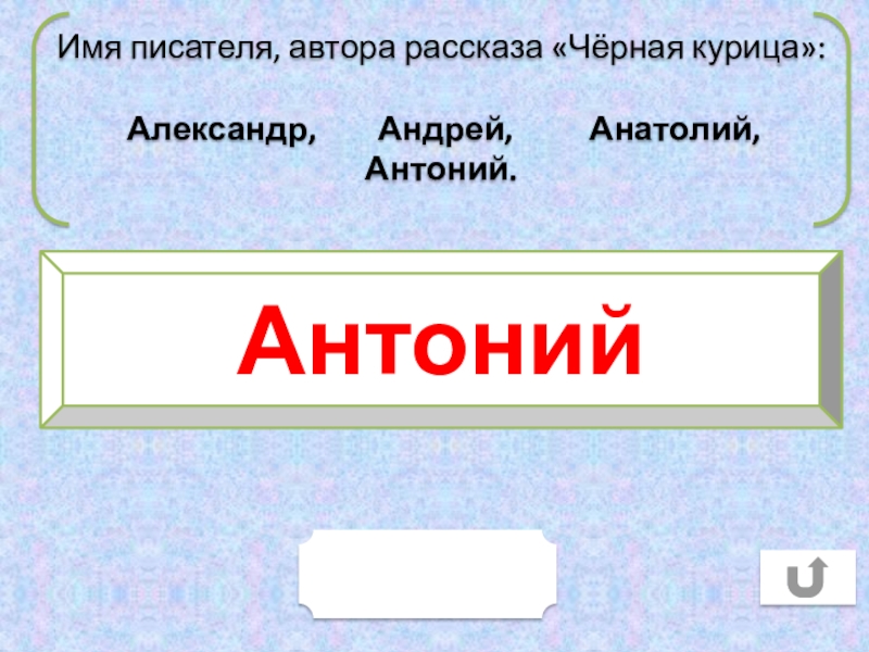 АнтонийИмя писателя, автора рассказа «Чёрная курица»: Александр,    Андрей,     Анатолий,