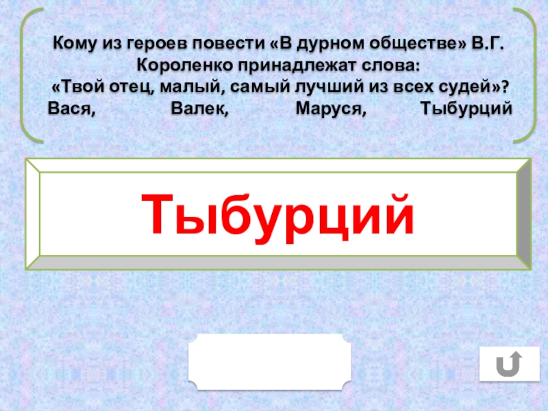 ТыбурцийКому из героев повести «В дурном обществе» В.Г. Короленко принадлежат слова: «Твой отец, малый, самый лучший из