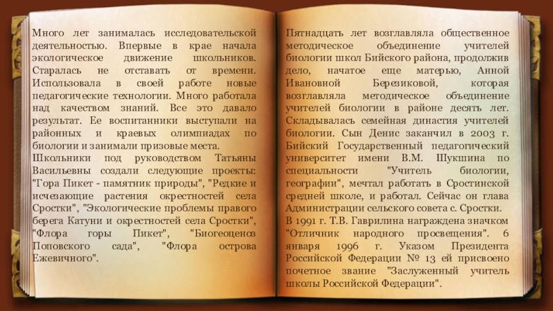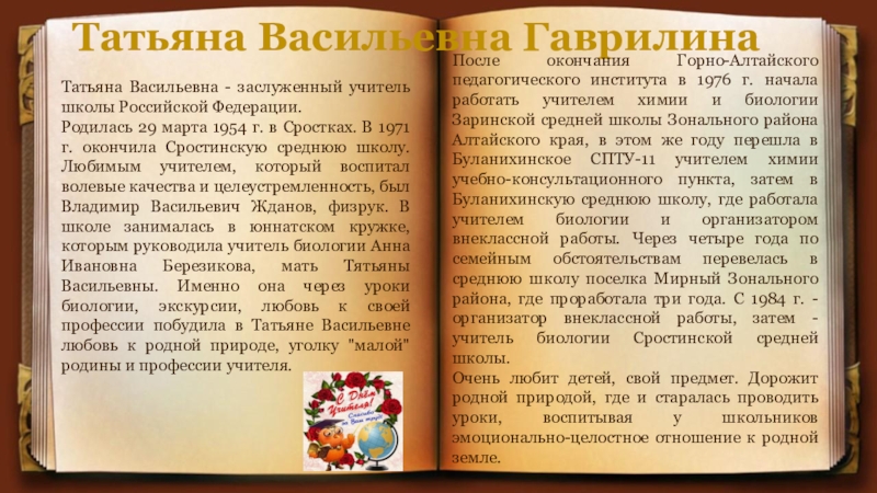 Очень любит детей, свой предмет. Дорожит родной природой, где и старалась проводить уроки, воспитывая у школьников эмоционально-целостное отношение к родной земле.