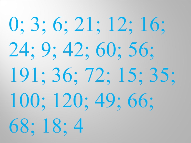 Слайд 160; 3; 6; 21; 12; 16; 24; 9; 42; 60; 56;
