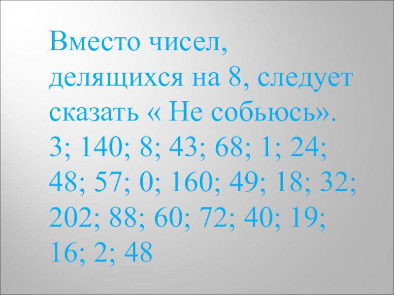 Слайд 17Вместо чисел, делящихся на 8, следует сказать « Не собьюсь».