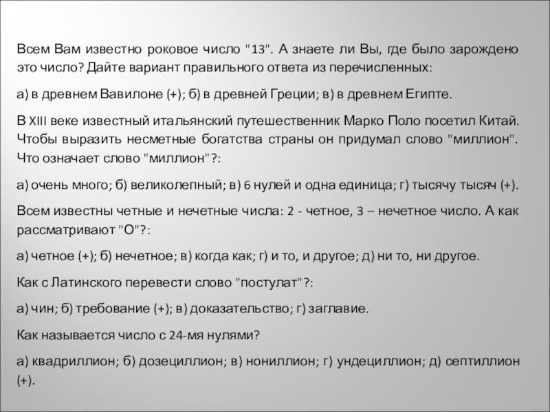 а) очень много; б) великолепный; в) 6 нулей и одна единица; г) тысячу тысяч (+).