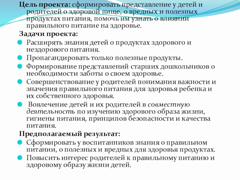 Слайд 4Цель проекта: сформировать представление у детей и родителей о здоровой пище,