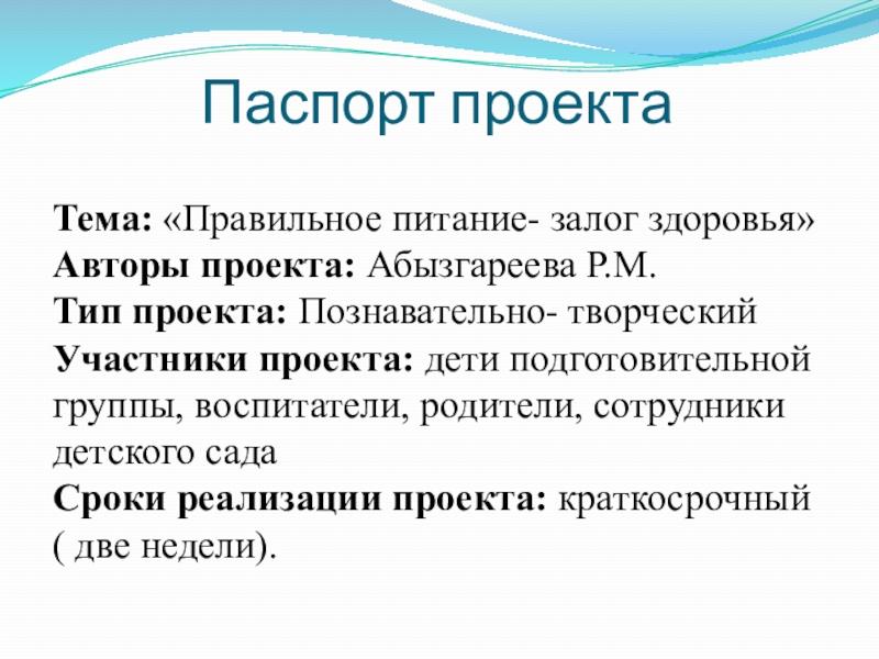 Паспорт проектаТема: «Правильное питание- залог здоровья»Авторы проекта: Абызгареева Р.М.Тип проекта: Познавательно- творческийУчастники проекта: дети подготовительной группы, воспитатели, родители, сотрудники детского садаСроки реализации проекта: краткосрочный ( две недели).