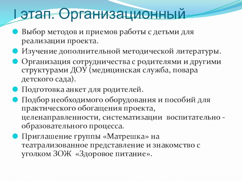 I этап. ОрганизационныйВыбор методов и приемов работы с детьми для реализации проекта.Изучение дополнительной методической литературы.Организация сотрудничества с