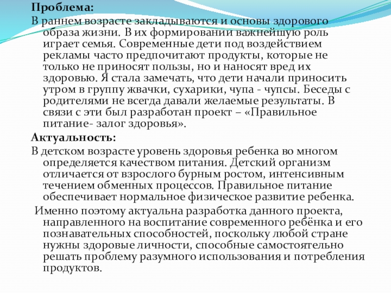 их формировании важнейшую роль играет семья. Современные дети под воздействием рекламы часто предпочитают продукты, которые не только не приносят пользы, но и наносят вред их здоровью. Я стала замечать, что дети начали приносить утром в группу жвачки, сухарики, чупа - чупсы. Беседы с родителями не всегда давали желаемые результаты. В связи с эти был разработан проект – «Правильное питание- залог здоровья».