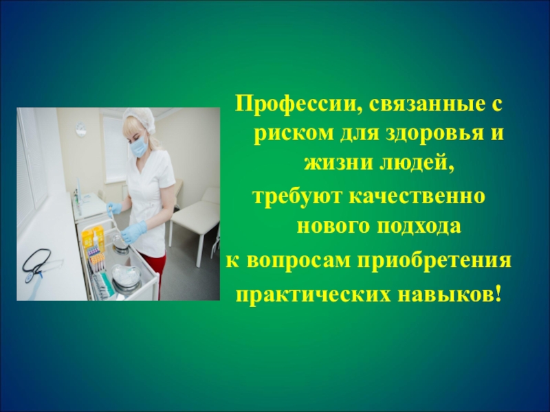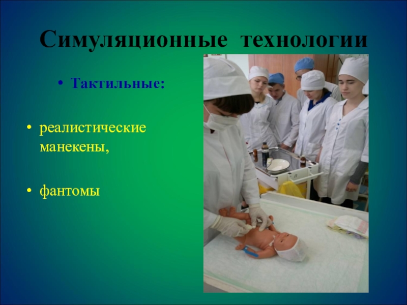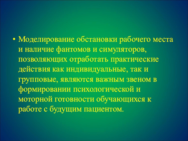 Слайд 4Моделирование обстановки рабочего места и наличие фантомов и симуляторов, позволяющих отработать