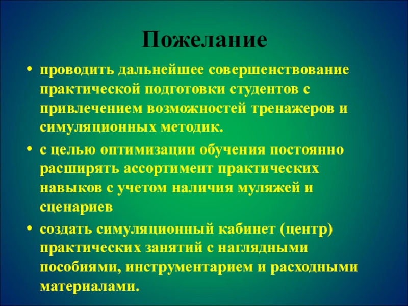 проводить дальнейшее совершенствование практической подготовки студентов с привлечением возможностей тренажеров и