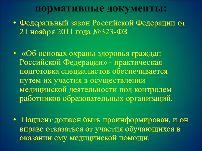 «Об основах охраны здоровья граждан Российской Федерации» - практическая подготовка специалистов обеспечивается путем их участия в осуществлении медицинской деятельности под контролем работников образовательных организаций.