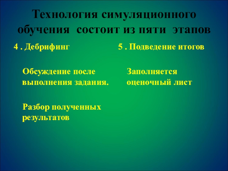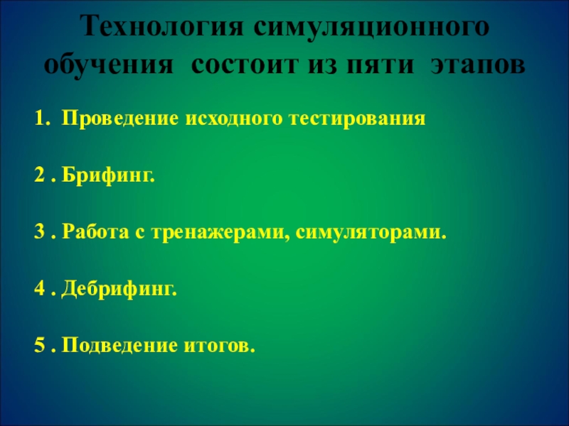 Слайд 12Технология симуляционного обучения состоит из пяти этапов