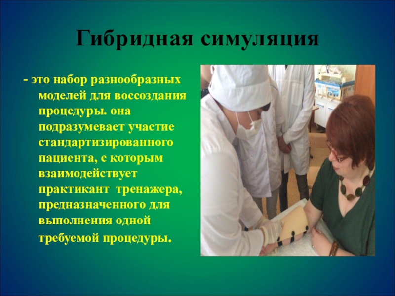 участие стандартизированного пациента, с которым взаимодействует практикант тренажера, предназначенного для выполнения одной требуемой процедуры.