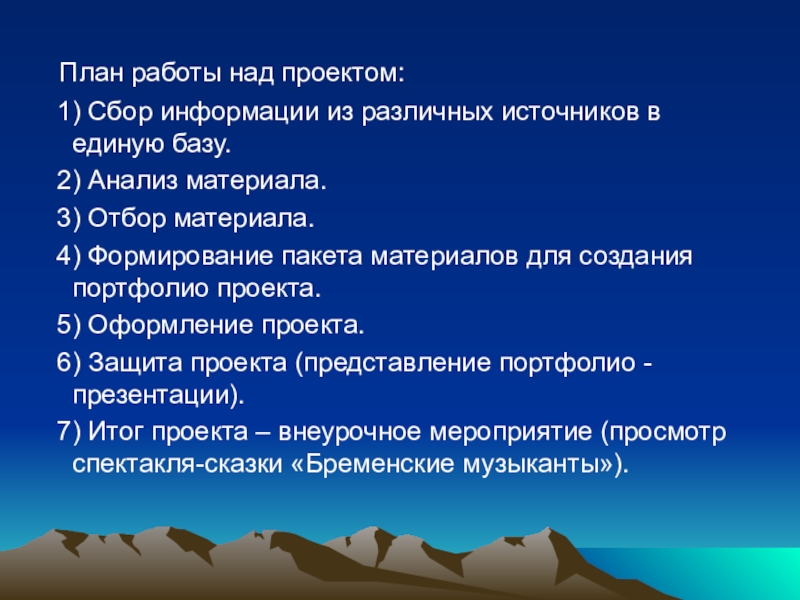 7) Итог проекта – внеурочное мероприятие (просмотр спектакля-сказки «Бременские музыканты»).