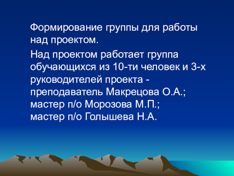 работает группа обучающихся из 10-ти человек и 3-х руководителей проекта - преподаватель Макрецова О.А.; мастер п/о Морозова М.П.; мастер п/о Голышева Н.А.