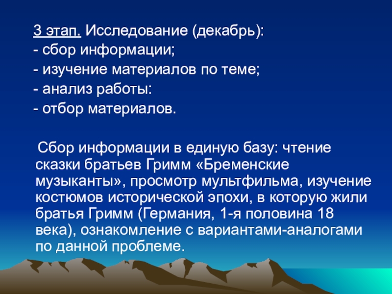 Сбор информации в единую базу: чтение сказки братьев Гримм «Бременские музыканты», просмотр мультфильма, изучение костюмов исторической эпохи, в которую жили братья Гримм (Германия, 1-я половина 18 века), ознакомление с вариантами-аналогами по данной проблеме.