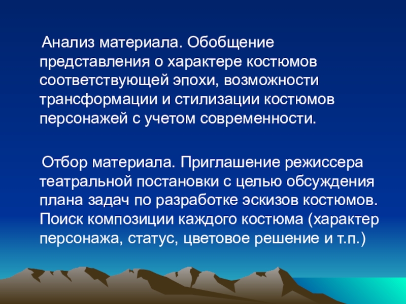 Отбор материала. Приглашение режиссера театральной постановки с целью обсуждения плана задач по разработке эскизов костюмов. Поиск композиции каждого костюма (характер персонажа, статус, цветовое решение и т.п.)