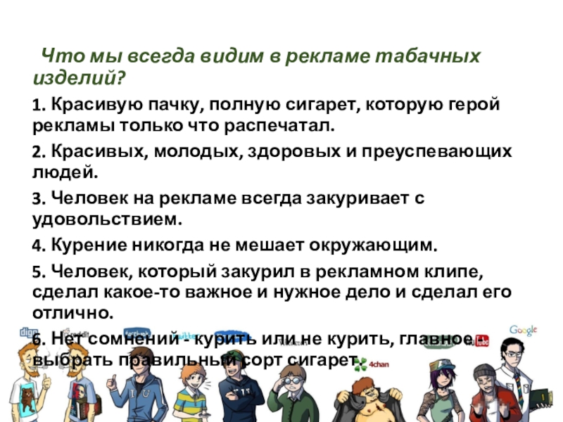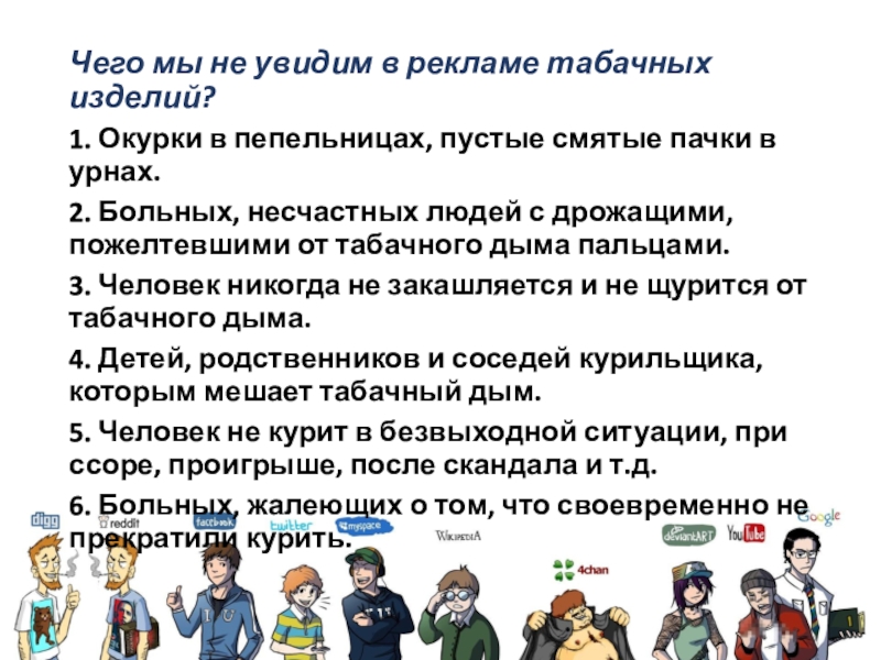 Слайд 16Чего мы не увидим в рекламе табачных изделий?