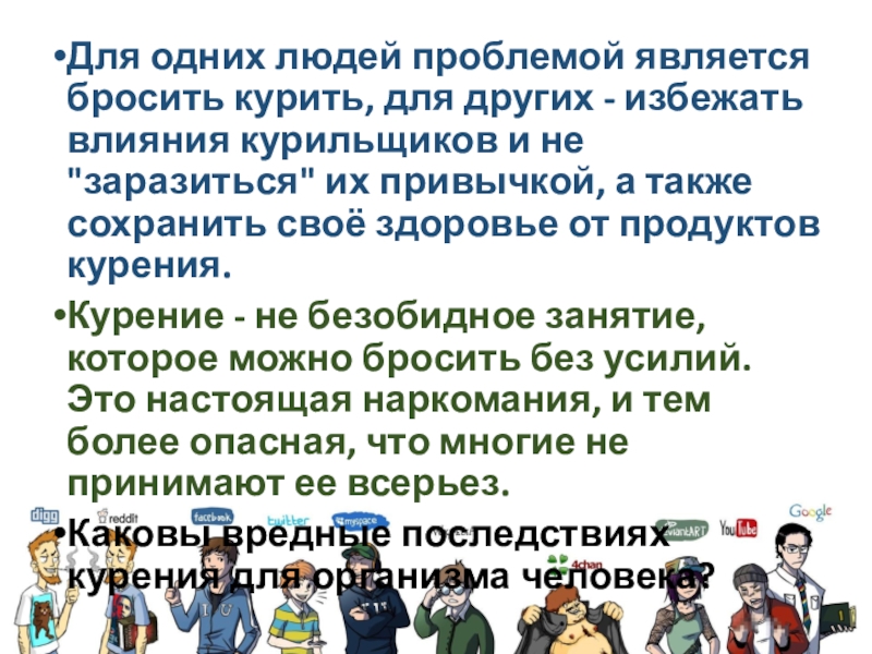 Слайд 4Для одних людей проблемой является бросить курить, для других - избежать