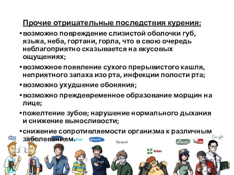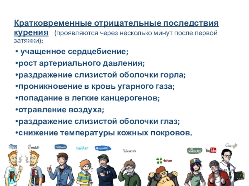 Слайд 5Кратковременные отрицательные последствия курения (проявляются через несколько минут после первой