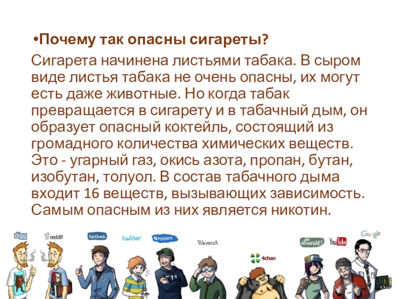 табака не очень опасны, их могут есть даже животные. Но когда табак превращается в сигарету и в табачный дым, он образует опасный коктейль, состоящий из громадного количества химических веществ. Это - угарный газ, окись азота, пропан, бутан, изобутан, толуол. В состав табачного дыма входит 16 веществ, вызывающих зависимость. Самым опасным из них является никотин.