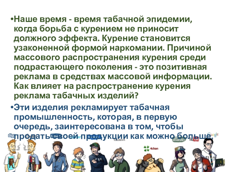 Слайд 12Наше время - время табачной эпидемии, когда борьба с курением не
