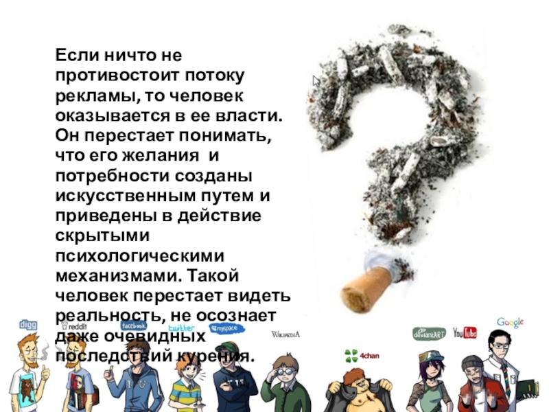 власти. Он перестает понимать, что его желания и потребности созданы искусственным путем и приведены в действие скрытыми психологическими механизмами. Такой человек перестает видеть реальность, не осознает даже очевидных последствий курения.
