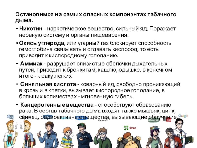 Слайд 11Остановимся на самых опасных компонентах табачного дыма.