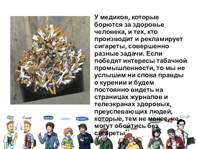 Слайд 13У медиков, которые борются за здоровье человека, и тех, кто производит
