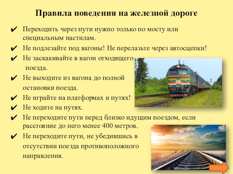 Не переходите пути перед близко идущим поездом, если расстояние до него менее 400 метров.