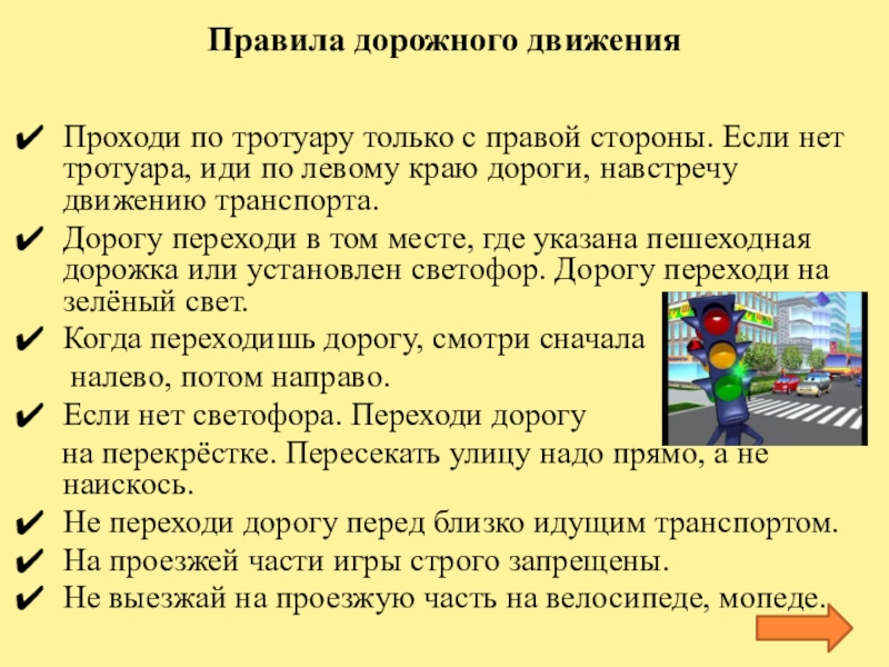 Дорогу переходи в том месте, где указaнa пешеходная дорожка или ycтановлeн светофор. Дорогу переходи на зелёный свет.